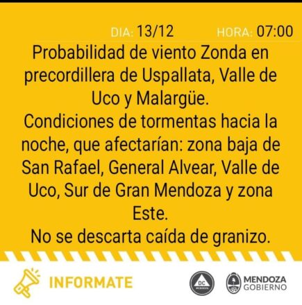 Cabe destacar, que también habrá condiciones de tormentas hacia la noche afectando zona baja de San Rafael, General Alvear, Valle de Uco, Sur de Mendoza y zona Este.