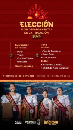 Este viernes, según informó la Municipalidad de San Carlos, se llevará a cabo la elección de la Flor Departamental de la Tradición 2025. El evento tendrá lugar el 10 de octubre en las instalaciones del Sport Club San Carlos, donde se desarrollarán distintas actividades que celebran la identidad cultural y las tradiciones locales.