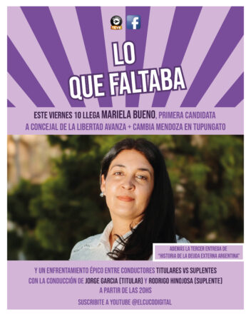 Este viernes feriado llega una nueva edición de Lo Que Faltaba al streaming de El Cuco Tevé, con una invitada especial: Mariela Bueno, candidata a concejal por la alianza Libertad Avanza + Cambia Mendoza en el departamento de Tupungato. En esta emisión, Jorge García y Rodrigo Hinojosa serán los encargados de entrevistarla, con el objetivo de conocer en profundidad sus propuestas y perspectivas de cara a las próximas elecciones.