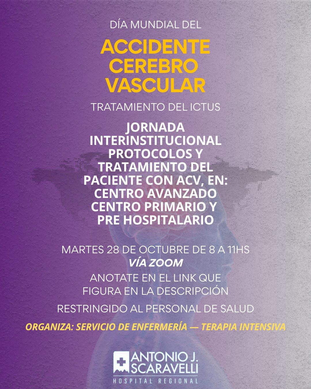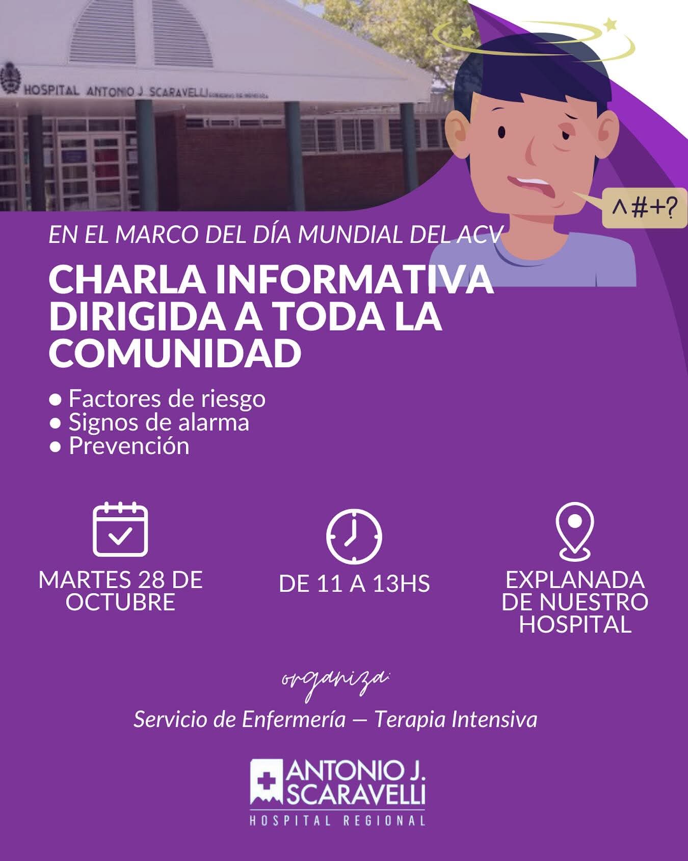 En el marco del Día Mundial del ACV (accidente cerebrovascular), personal del servicio de Terapia Intensiva del Hospital Scaravelli, realizará una jornada para saber cómo actuar en caso de que una persona sufra un ACV.