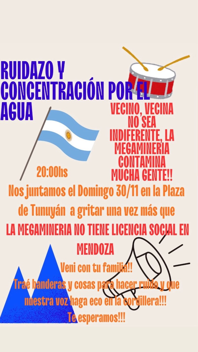 Este domingo a partir de las 20 horas, los vecinos de Tunuyán se autoconvocan en la plaza departamental para “hacer ruido” en contra de la instalación de la minera San Jorge.